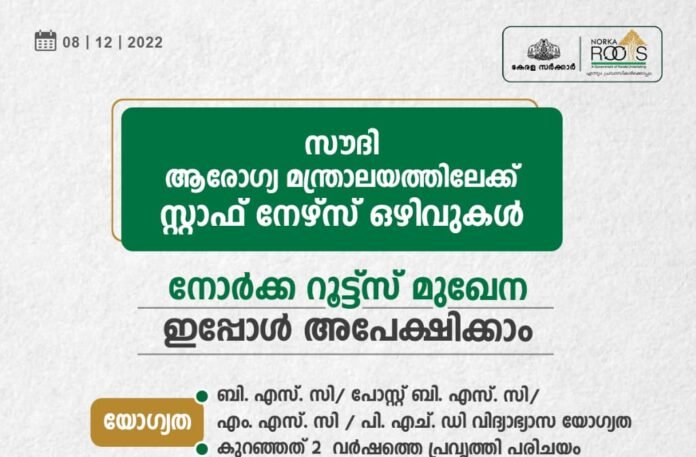സൗദി അറേബ്യയിലെ ആരോഗ്യ മന്ത്രാലയത്തിലേയ്ക്കുളള (MoH) വനിതാ നേഴ്സുമാരുടെ ഒഴിവുകളിലേയ്ക്ക് നോര്ക്ക റൂട്ട്സ് വഴി ഇപ്പോള് അപേക്ഷിക്കാം. നഴ്സിങ്ങില് ബി.എസ് സി/ പോസ്റ്റ് ബി.എസ് .സി/ എം. എസ് .സി / പി .എച് .ഡി വിദ്യാഭ്യാസ യോഗ്യതയും, കുറഞ്ഞത് 2 വര്ഷത്തെ പ്രവൃത്തി പരിചയവും വേണം. കാര്ഡിയോളജി/ ER/ ICU/ NICU/ ONCOLOGY/ OT (OR )/ PICU/ ട്രാന്സ്പ്ലാന്റ് എന്നീ ഡിപ്പാര്ട്മെന്റുകളിലേക്കാണ് റിക്രൂട്ട്മെന്റ് . താത്പര്യമുള്ള ഉദ്യോഗാര്ത്ഥികള് നോര്ക്കാ റൂട്സിന്റെ ഔദ്യോഗിക വെബ്സൈറ്റ് ആയ www.norkaroots.org ല് നല്കിയിരിക്കുന്ന ലിങ്ക് (https://forms.gle/mBi7ink29sbhv9wE9) വഴി അപേക്ഷിക്കേണ്ടതാണ്. പ്രായപരിധി 35. അപേക്ഷകള് ലഭിക്കേണ്ട അവസാന തീയ്യതി 2022 ഡിസംബര് 12.